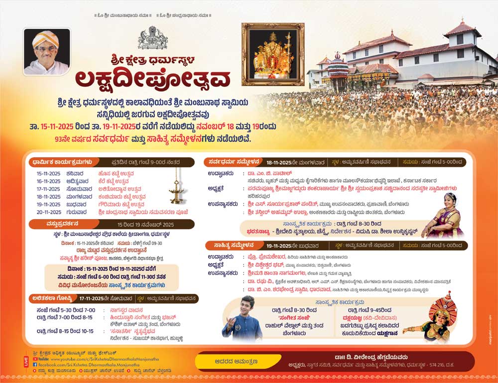 Dharmasthala : The Laksha Deepotsava (Festival of Lights), an important annual celebration during the Hindu month of Karthika at the sacred Shree Kshetra Dharmasthala, commenced its festivities on Saturday with the inauguration of a state-level exhibition. The exhibition is being held at the Shree Manjunatheshwara High School premises.